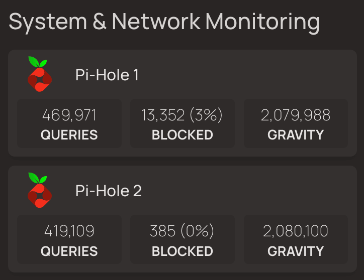I monitor both pi-holes from my Homepage dashboard, and since setting up Pi-Hole2 I’ve noticed an abnormally large number of queries (per 24 hours) that never settled out after several days: