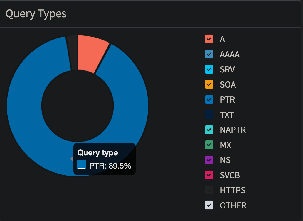 Both pi-hole dashboards show an outsized number of pointer (PTR) requests, which are used for reverse DNS lookups:
