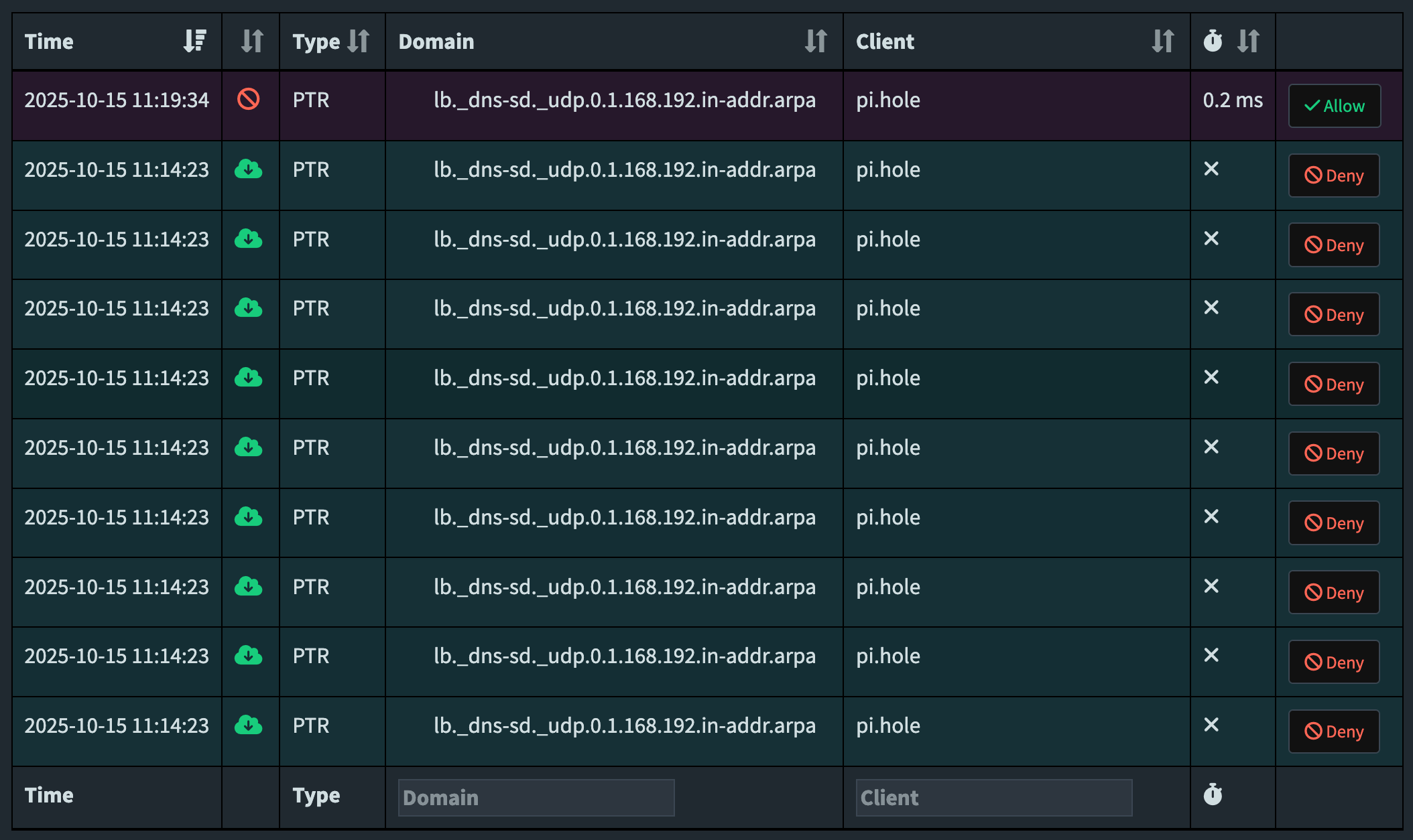 lb._dns-sd._udp.,db._dns-sd._udp., andb._dns-sd._udp.queries to pi-hole2. Pi-hole2 cannot resolve the request and sends it back to pi-hole1. Repeat back and forth on port 53 until the rate limit is hit. Over and over, 1000 requests every time an Apple device tries to discover if there’s an authoritative DNS-SD server on the network.