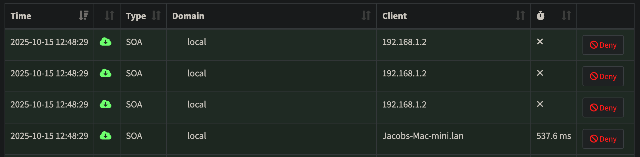 I’m not sure if there can be a proper fix for this Apple Bonjour interaction from the pi-hole team, given that it’s relatively niche to run multiple pi-holes, and the custom dnsmasq configurations I tried didn’t seem to do anything. Maybe they could implement a toggle setting to “silence Apple Bonjour conditional forwarding loops” that implements the regex deny on the backend?